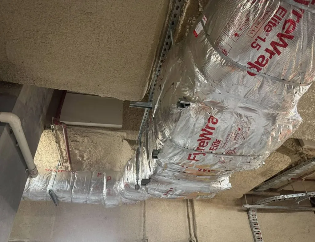 We apply vermiculite fire spray to structural steel and ductwork to improve fire resistance and thermal protection. This mineral based coating insulates critical elements helping maintain structural integrity during high heat conditions.